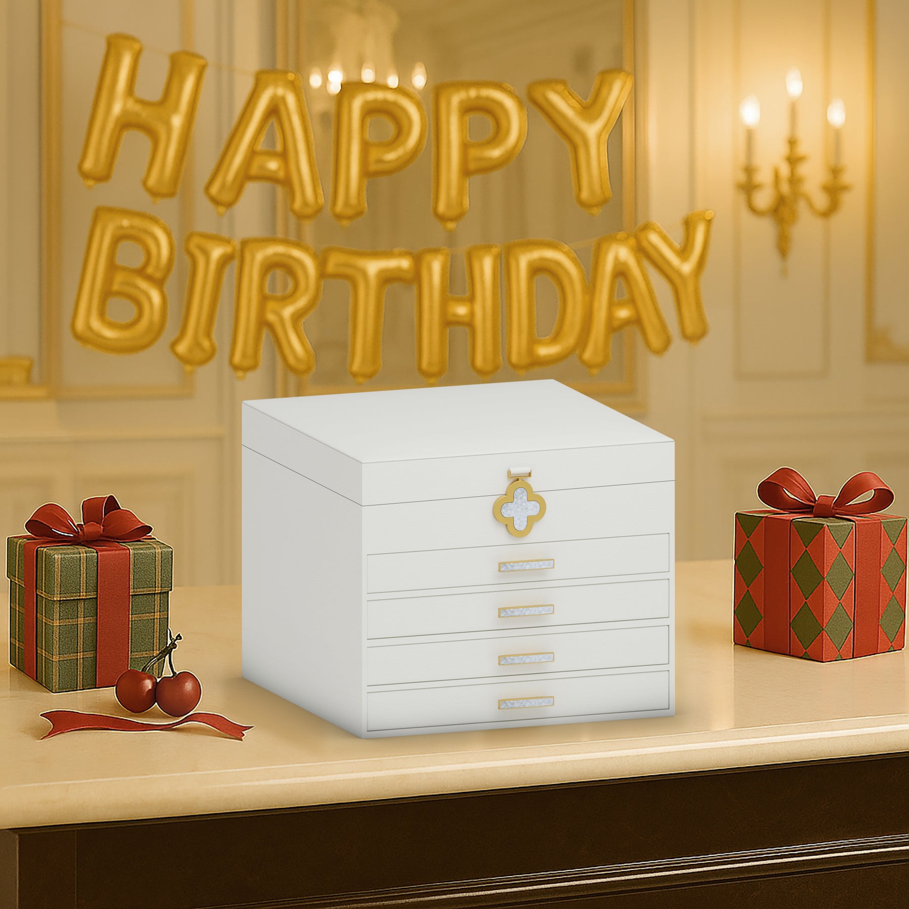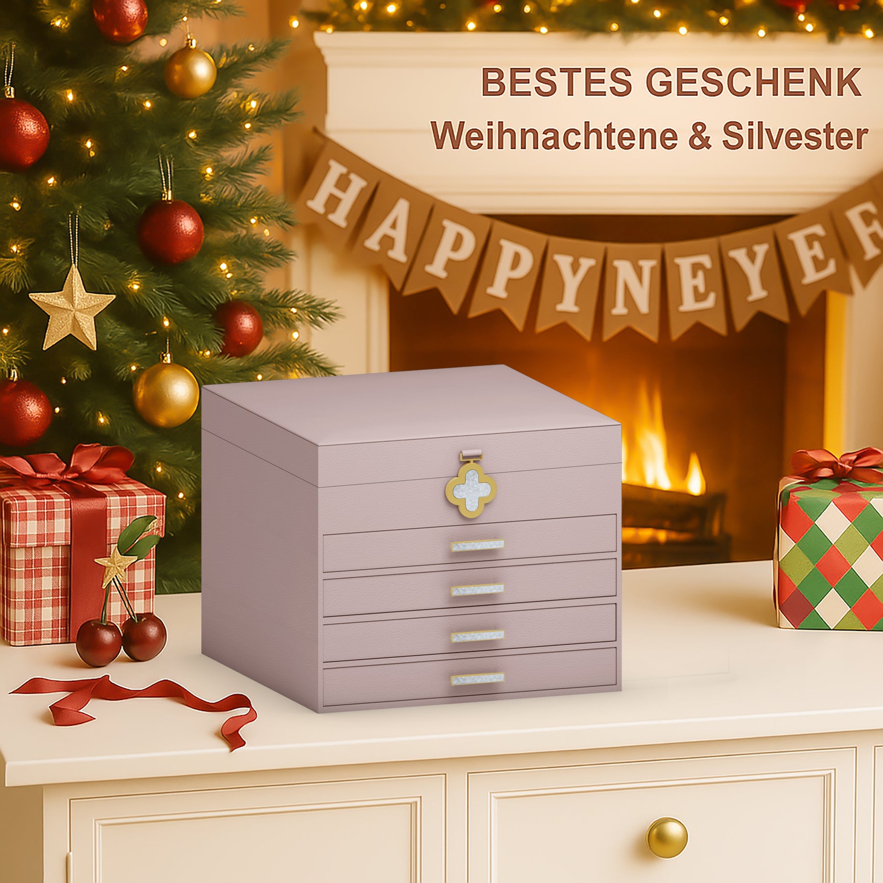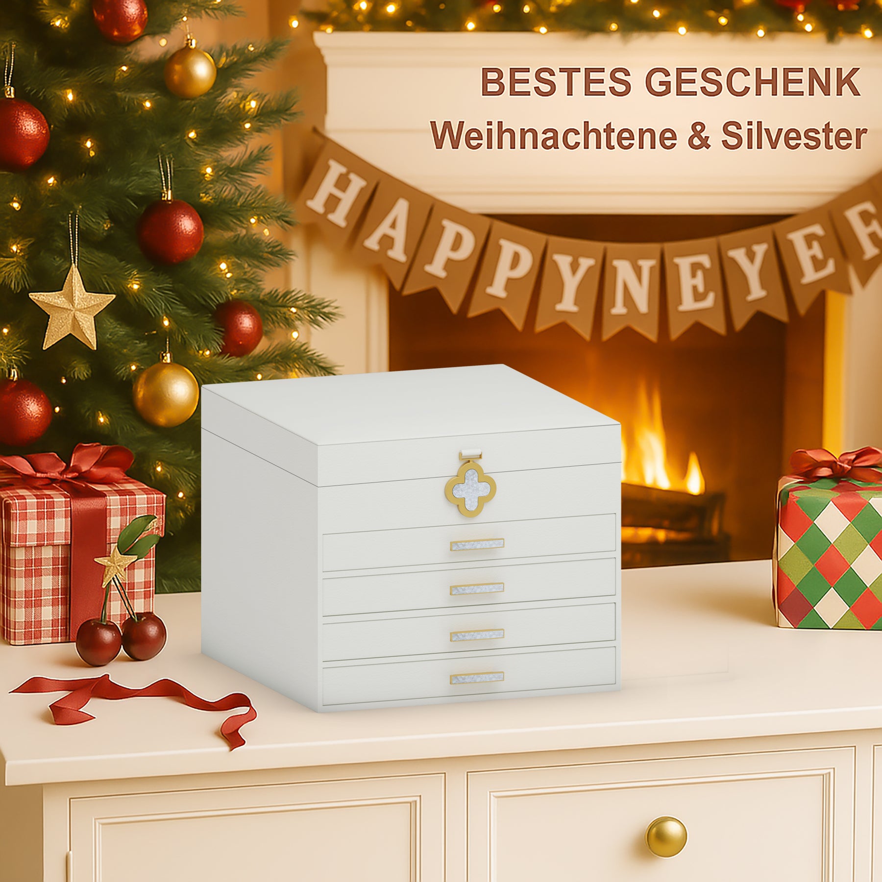 In einer warmen, festlichen Atmosphäre steht die dreistöckige Kinder-Musikschmuckbox elegant auf dem Tisch. Beim Öffnen erklingt eine sanfte Melodie, während das liebevoll gestaltete Design eine märchenhafte Stimmung schafft. Die drei Schubladen sorgen für eine ordentliche Aufbewahrung kleiner Schätze und machen die Box zu einem besonderen Geschenk für Kinder.
