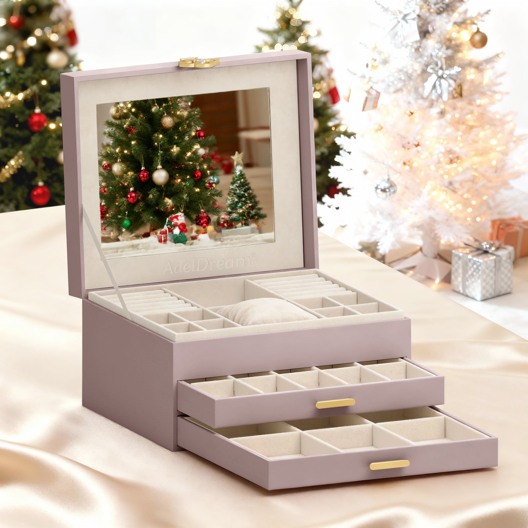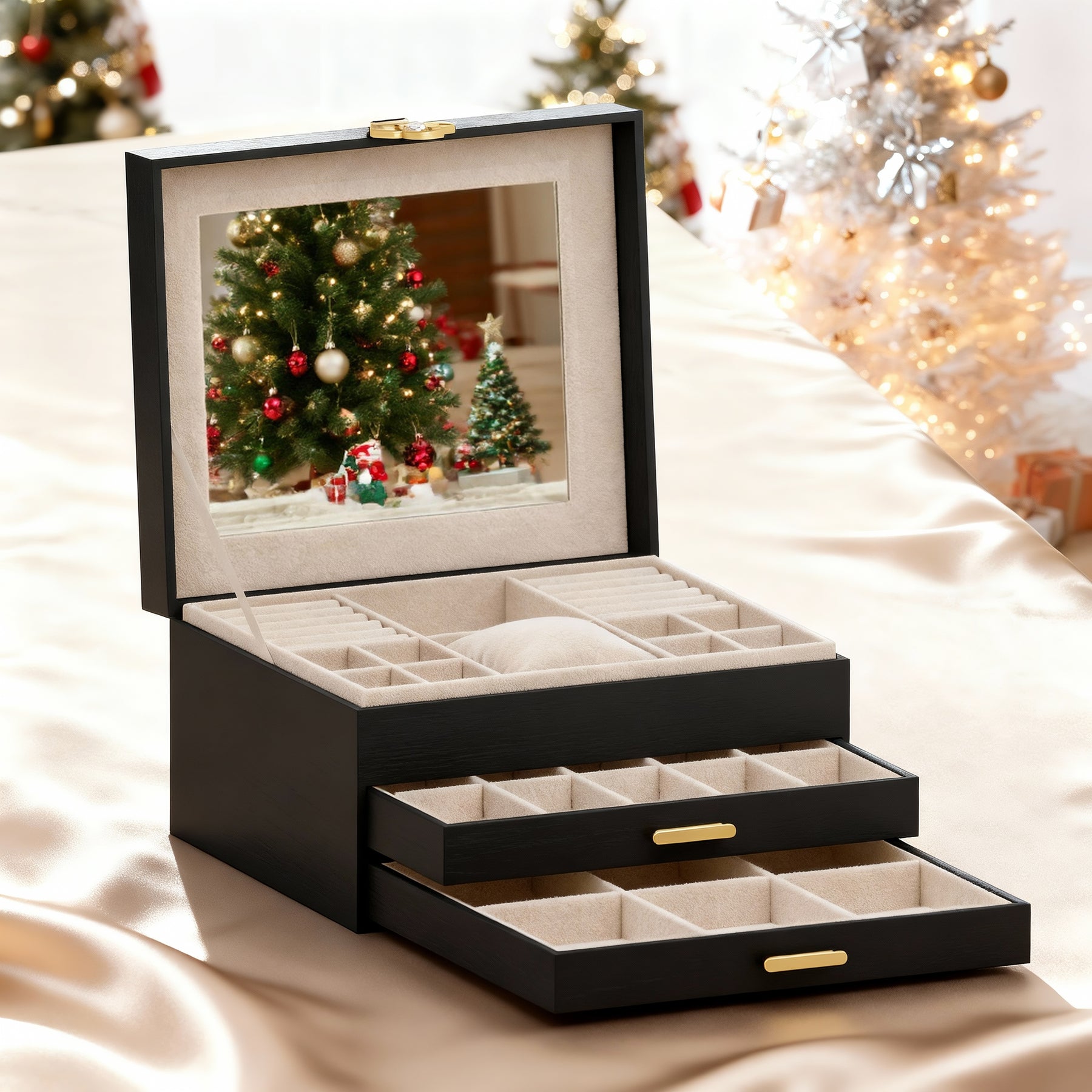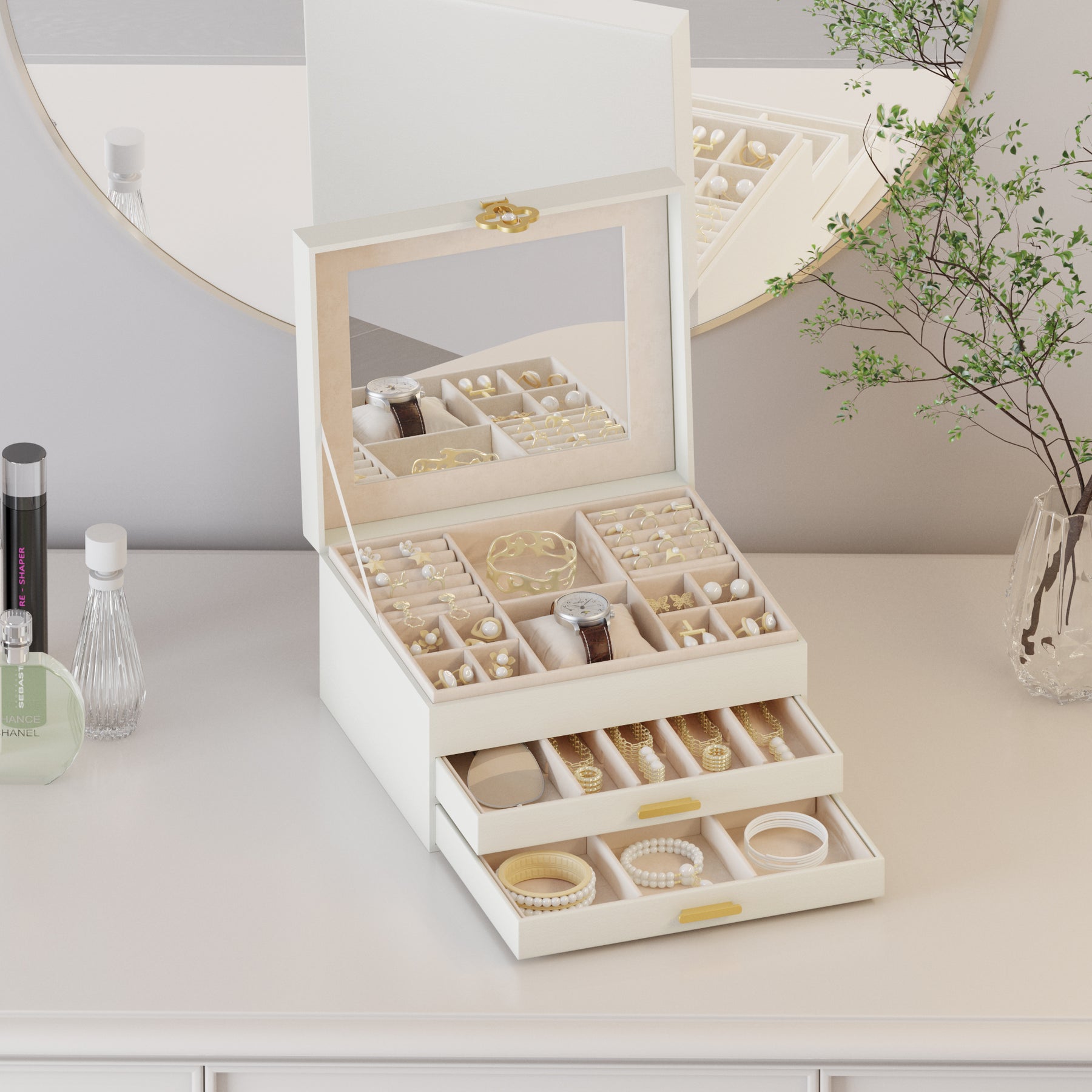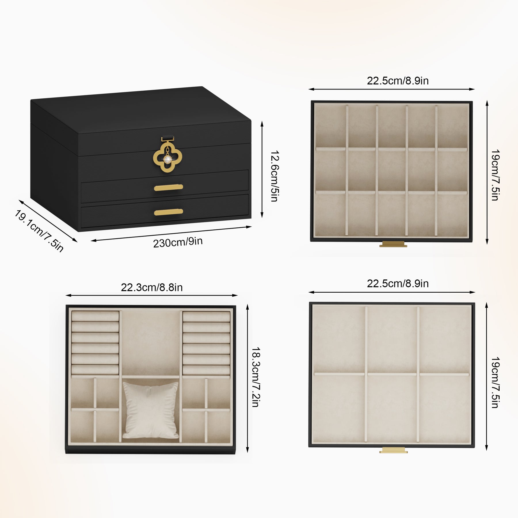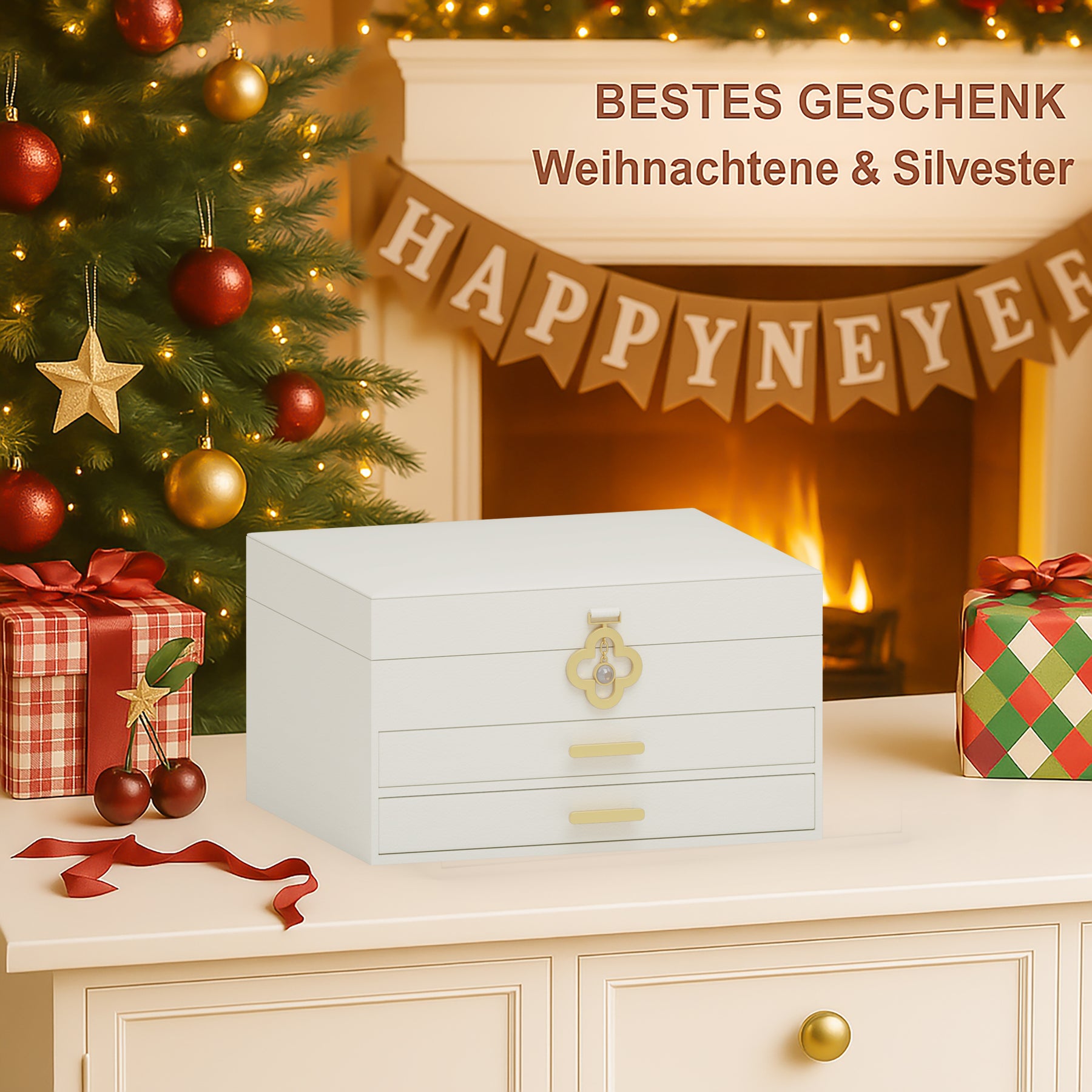 3 Etagen und 2 Schubladen für viel Stauraum Mit 3 Etagen und 2 Schubladen bietet die Schmuckschatulle ausreichend Platz, um Ringe, Halsketten und Ohrringe ordentlich zu verstauen und Ihre Sammlung perfekt zu organisieren.